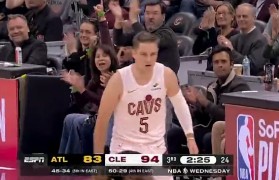 虎扑04月09日讯 NBA常规赛,骑士主场迎战老鹰的比赛正在进行中。比赛的第三节,梅里尔三分命中,骑...