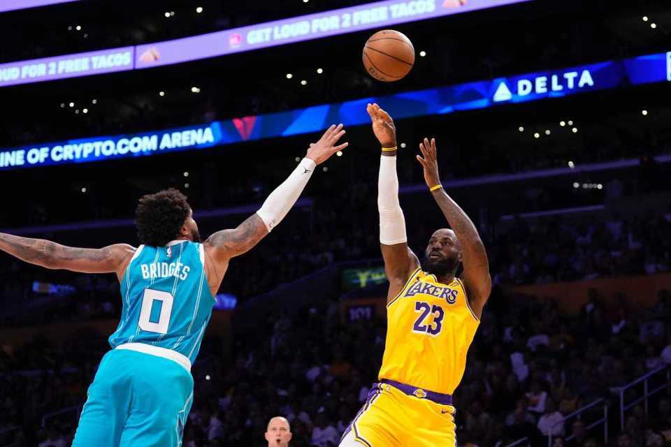 中场休息回来,双方进攻火力进一步提升,湖人本场第二次单节得分35+,且比第二节多得到22分,但黄蜂首次单节狂轰40分。湖人被拉开60-74落后,东契奇第三节回暖单节得分15分,引领湖人持续反扑追到89-93仅差4分。黄蜂随后内外开花重新扩大两位数领先优势,湖人单节38-40再输2分,三节结束湖人93-104落后黄蜂。前三节比赛,湖人三分28中12,东契奇5记三分34+3+4与詹姆斯20+8+6,引领4人得分上双;黄蜂三分36中16,布里奇斯23+8与三球18+5+9,引领4人得分15+。