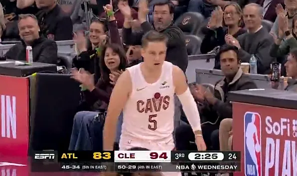 比赛的第三节,梅里尔三分命中,骑士第三节已打出34-16领先到两位数分差。
