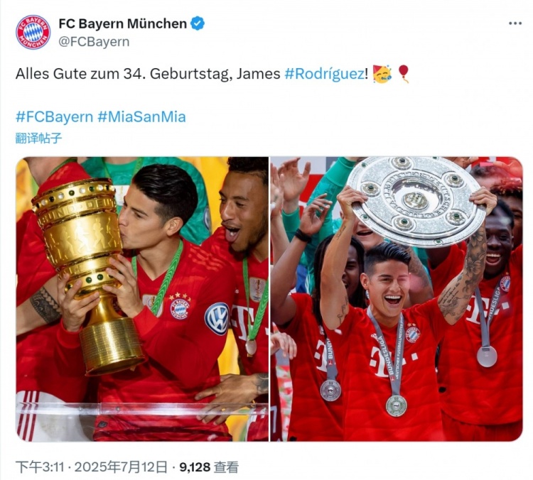7月12日讯 今天是哥伦比亚球星哈梅斯-罗德里格斯的34岁生日,老东家拜仁为他送上祝福。