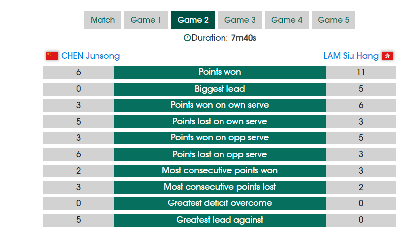 第三局陈俊菘开场2-1领先,随后林兆恒直接打出3-0的攻势反超,其后陈俊菘就再度落入下风一直被迫追分,林兆恒9-7领先,随后10-8局点,陈俊菘8-11再输一局。