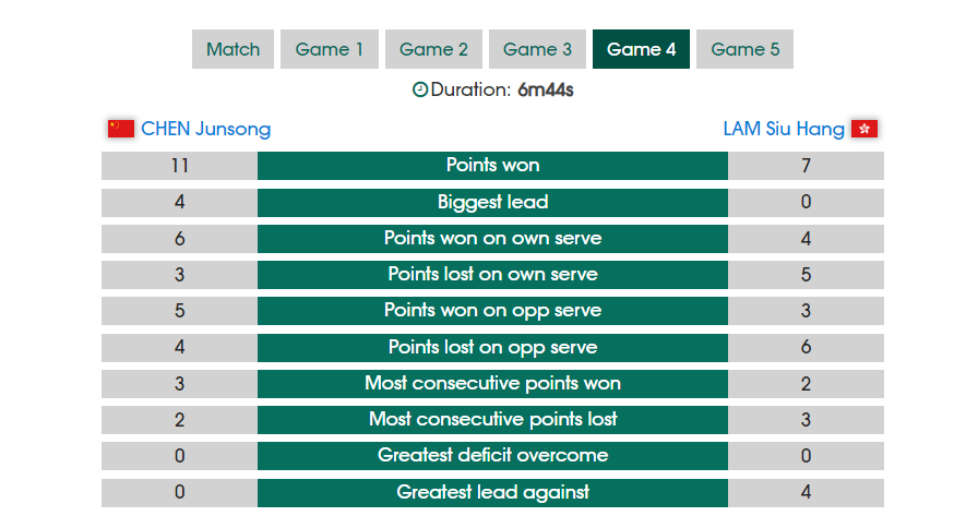第四局等于是陈俊菘的生死一线,这一局他终于迸发出了无限的能量,开场就一直处于领先,最终11-7将比赛拖入决胜局。